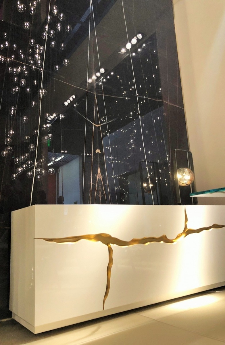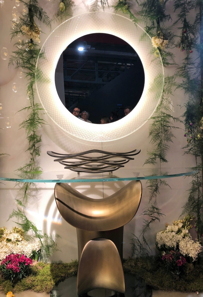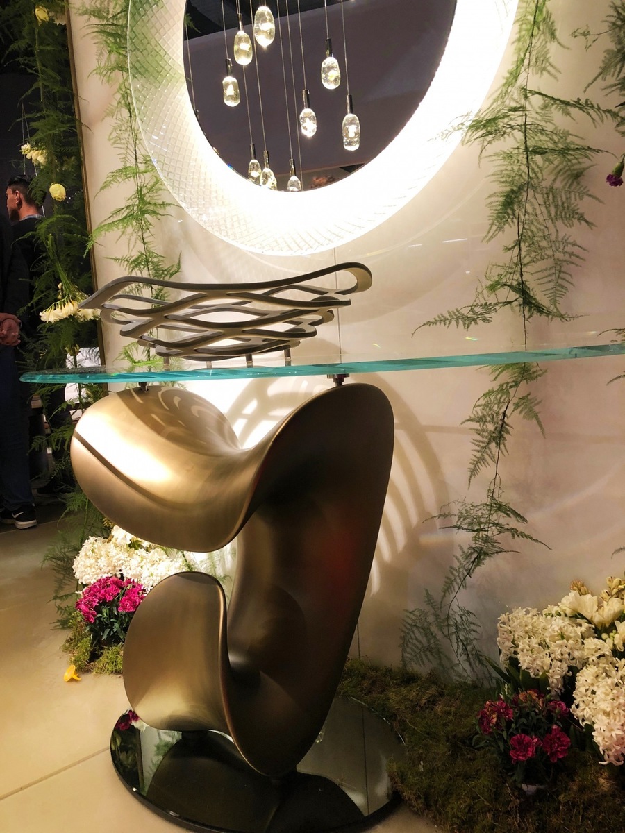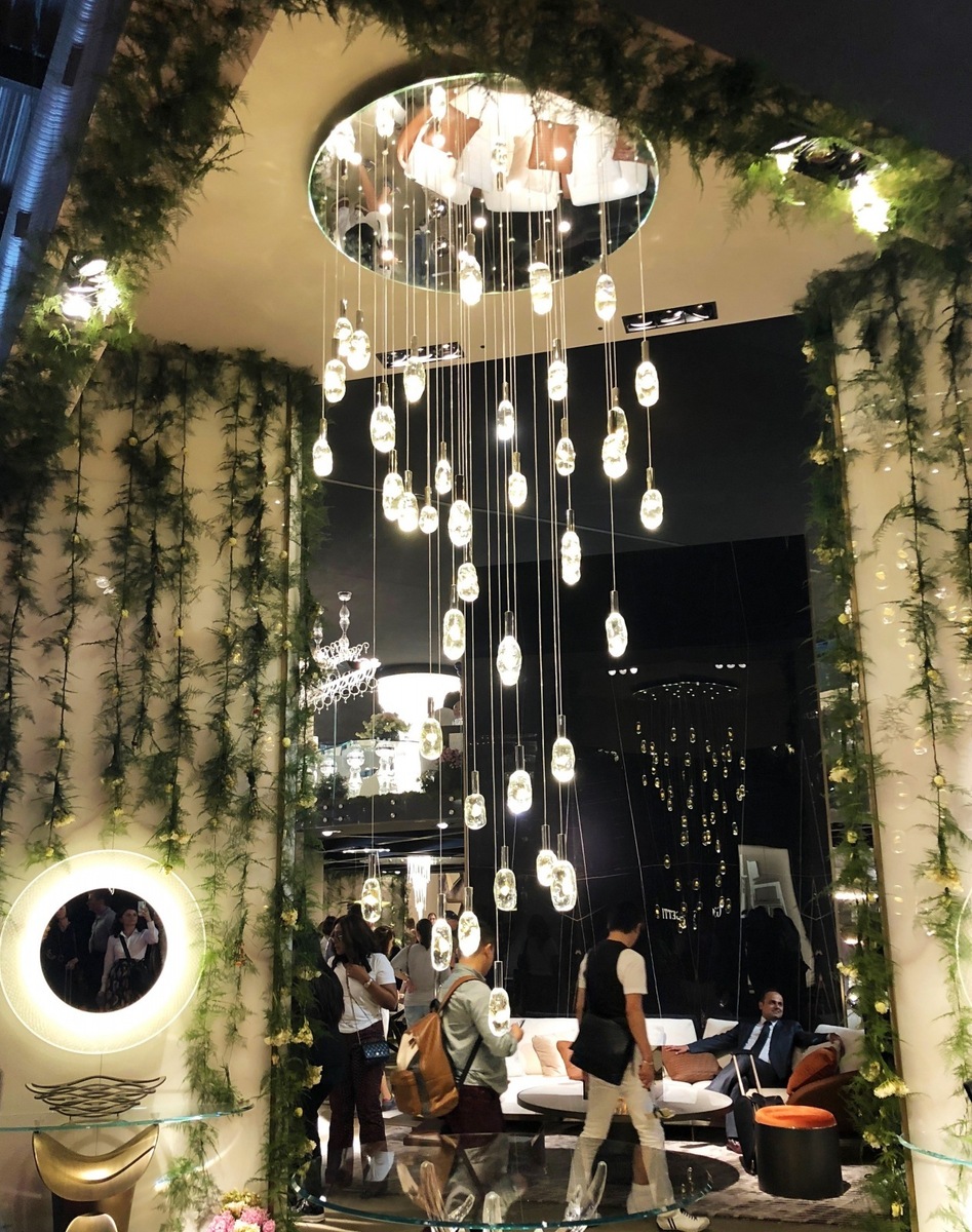 The brand has made a stunning presentation welcoming visitors by a dreamlike atmosphere full of original glass and lighting compositions. We have entered a magic world letting ourselves be charmed by the unique chandeliers which also excelled by their untraditional and very interesting design of use; being suspended from the ceiling like pieces of cool icicles.