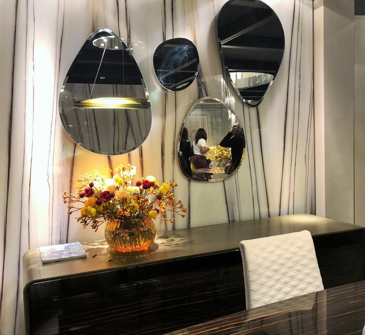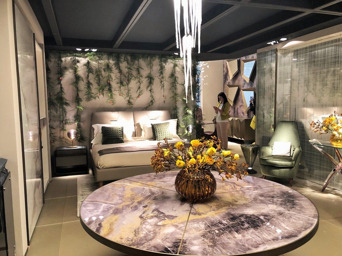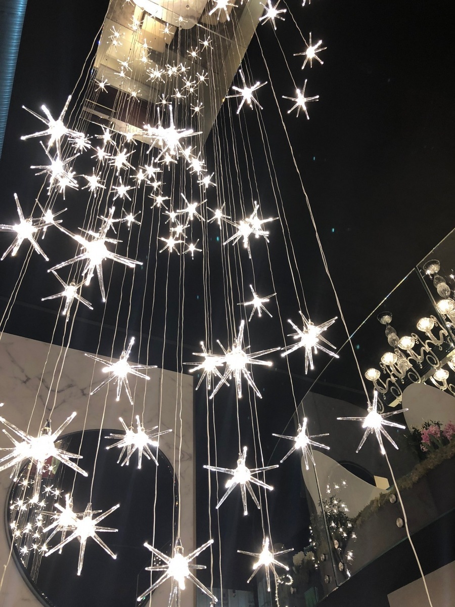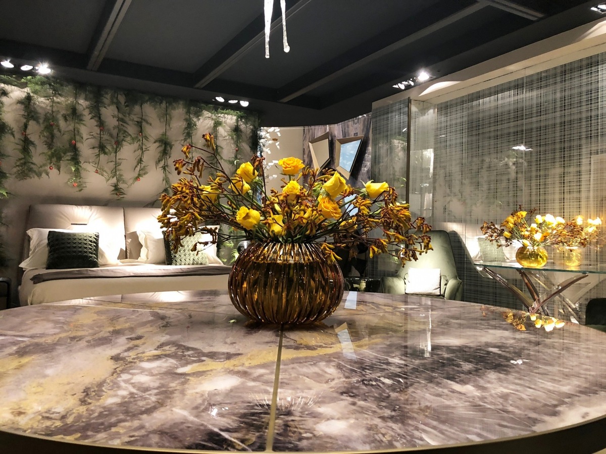 The brand has made a stunning presentation welcoming visitors by a dreamlike atmosphere full of original glass and lighting compositions. We have entered a magic world letting ourselves be charmed by the unique chandeliers which also excelled by their untraditional and very interesting design of use; being suspended from the ceiling like pieces of cool icicles.