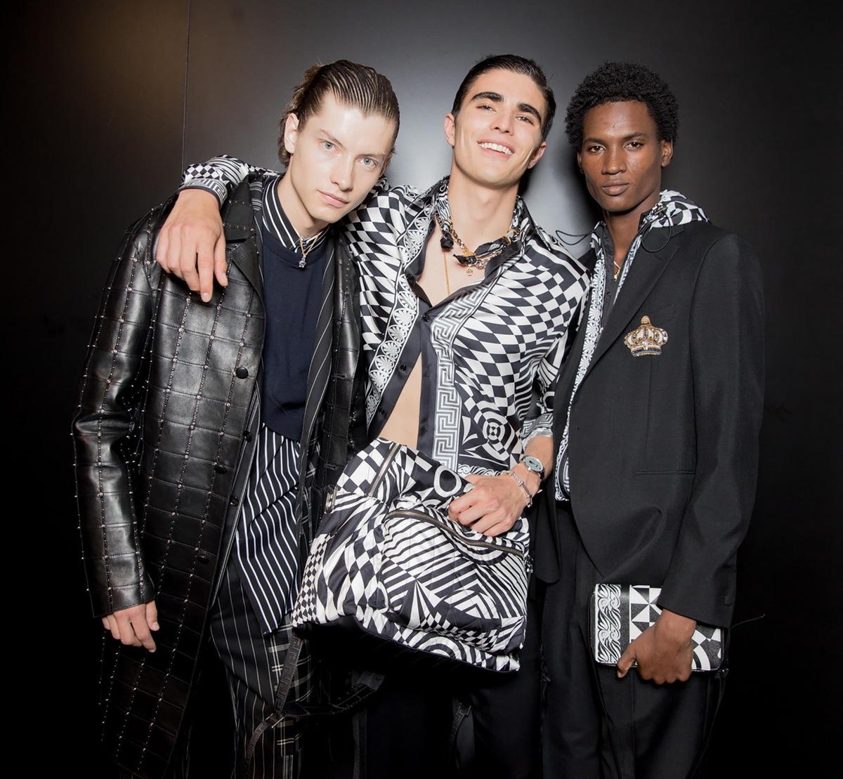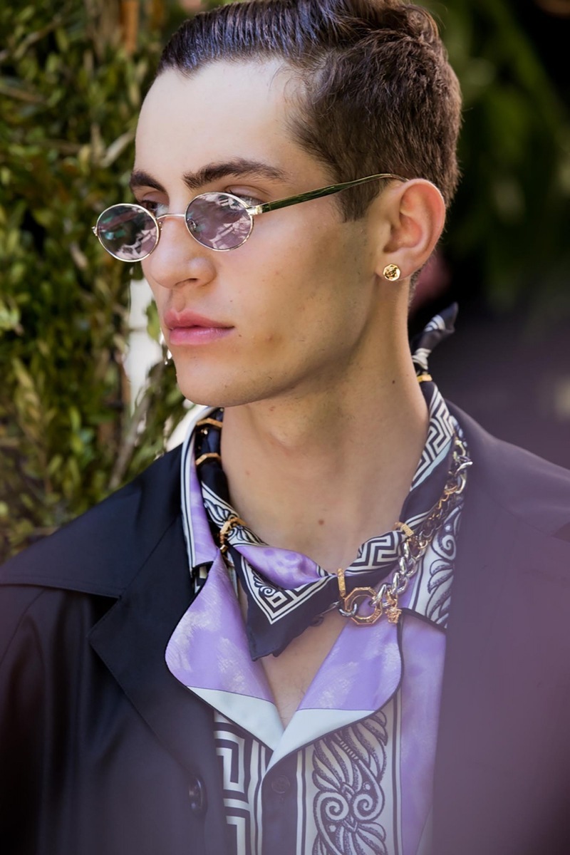 With what did Versace’s men’s collection impress Milan? Several lines can be identified. One in the spirit of sophisticated luxury, dominated by black coats and trousers with fine white stripes. These dark items are complemented by elegant red sweaters and pure-white shirts or shirts with a typical pattern. Dominated by loose trousers, jackets, and loose shirts, the next line focused on models inspired by street art. Everything is in black, white, and shades of blue. But knowing how to surprise, Versace also presented men’s models in pale pink.
