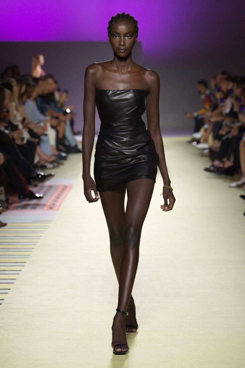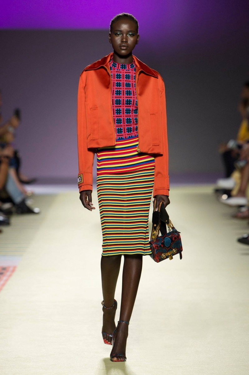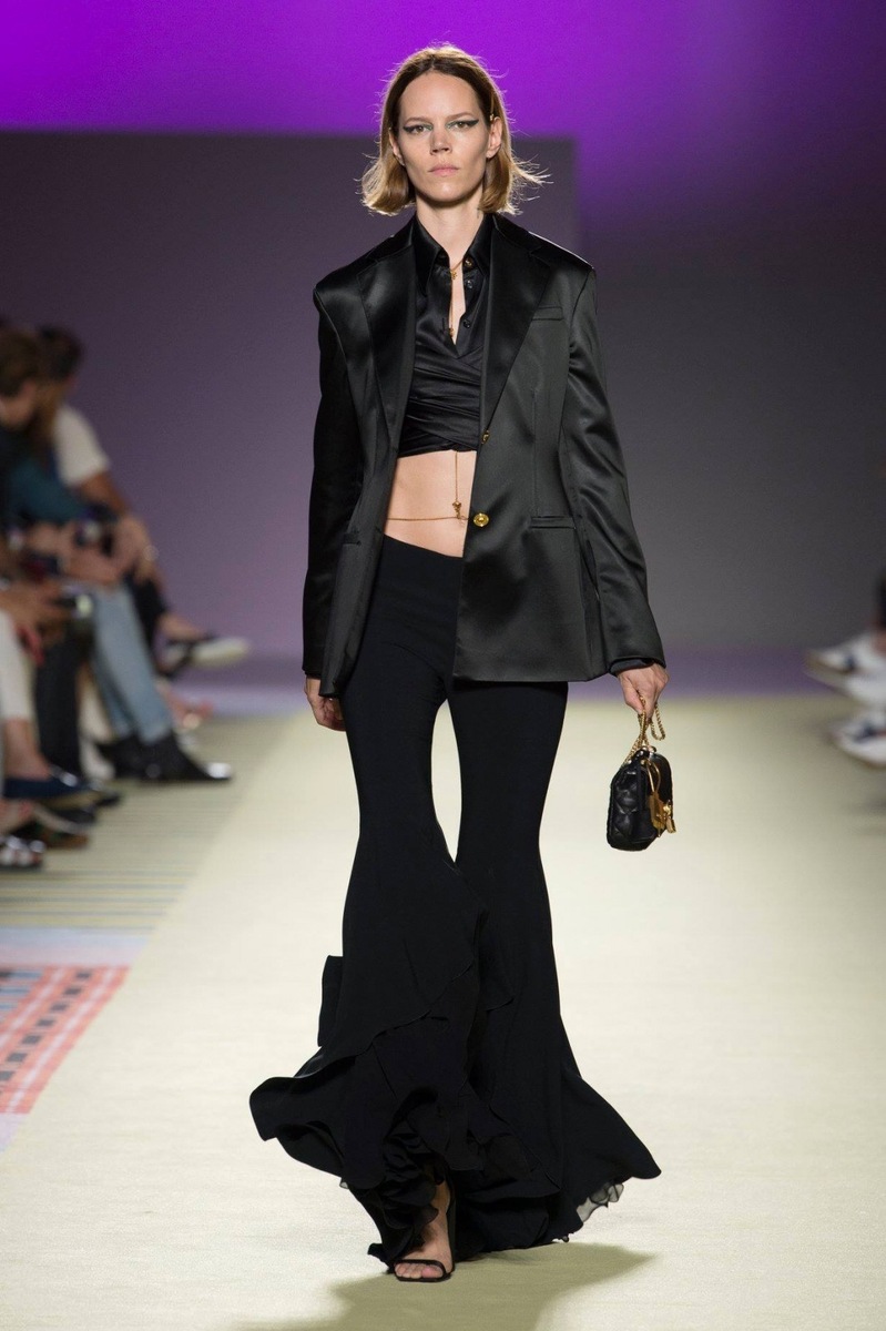 As regards the cuts, there are many to be seen in the luxury SS19 collection. We like jackets with trousers complemented by a T-shirt with the Versace inscription, as well as the above-stated looks with beautiful flowers. That is not all; however, because this collection offers much more. For a party every woman will appreciate a sexy leather mini dress which looks sensational, highlighting feminine curves. Luxurious, too, are models made of shimmery satin material which beautifully fits the figure.