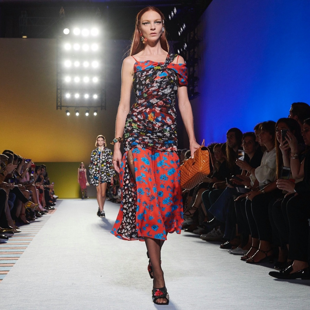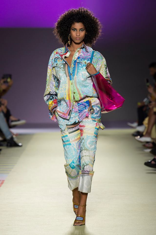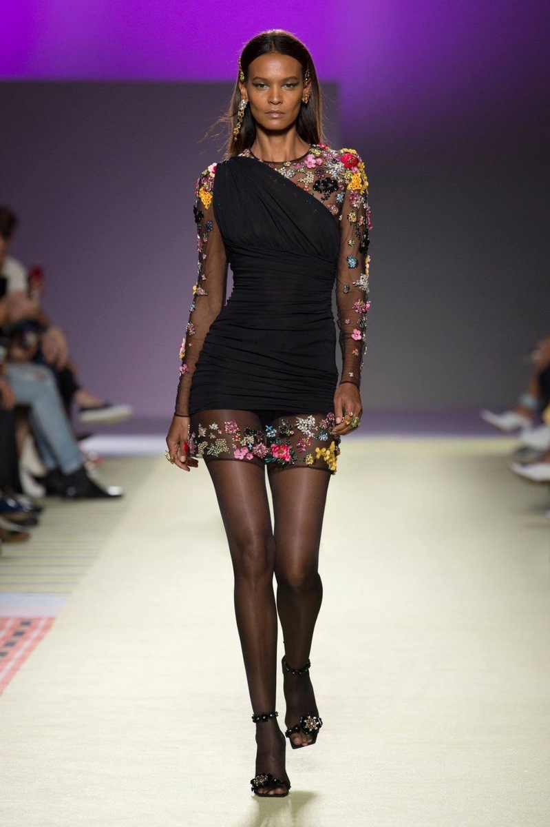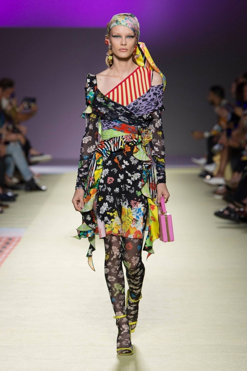 The luxury SS19 collection has at first glance charmed us by its colourful nature and also by the fact that it contains several styles which have one thing in common, that is luxury flair. The most extravagant pieces are those of denim with colourful prints and several designs at once, which combine to create casual, easy fashion. Such jackets, dresses, shirts, jeans and skirts will next summer clearly be a must-have piece. To take it all to another level, there were models decorated by beautiful luxurious colourful blossoms. 3D-style blooms beautifully finished the models, giving them a romantic touch. However, the models did not make a sweet impression, but in combination with black background rather a dramatic one. Will you try the nineties fashion?