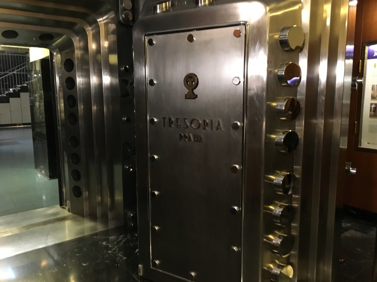 The vault is located all the way underground. It is no longer in use, so there aren't millions of crowns hidden inside it, nor gemstones nor securities. There is still something to be found there, though, and that is the People and Money exposition, and also a bar of gold.