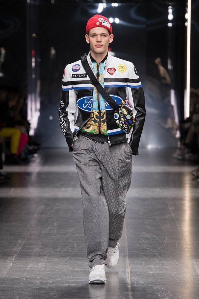 During the luxury show we could not ignore the Ford logo printed on the clothing. The car manufactured joined forces with the Versace fashion house and produced a number of models with an oval logo, which were presented at the Milan Fashion Week. The logo graced leather jackets, trousers, sneakers, sweatshirts, but it is also to be seen on details such as the buttons. So, if you like one of the brands, you will certainly love these outfits!