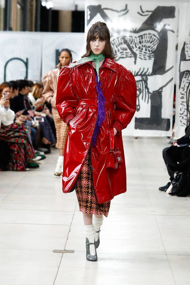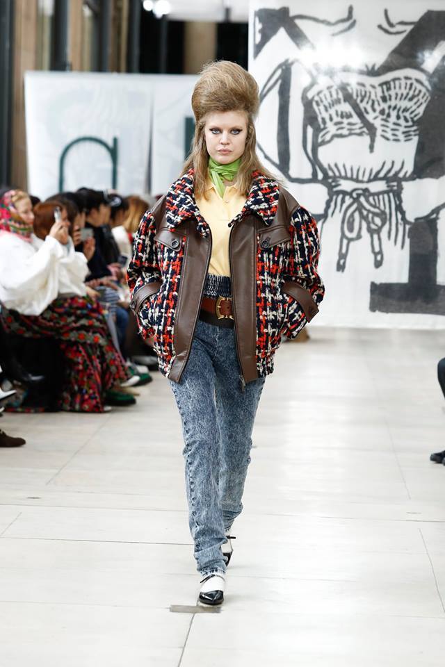 Elle opened the deluxe show in an oversized camel coat, a blue bandanna and eccentric shoes with a zip, buckles and a satin bow. The young actress also closed the show and remained faithful to oversized volume. She brought out a tweed coat combined with leather, she replaced her blue bandanna with a lime green one and wore futuristic silver shoes. Her maxi hair volume, which was an essential accessory for a number of other models, completed her look.