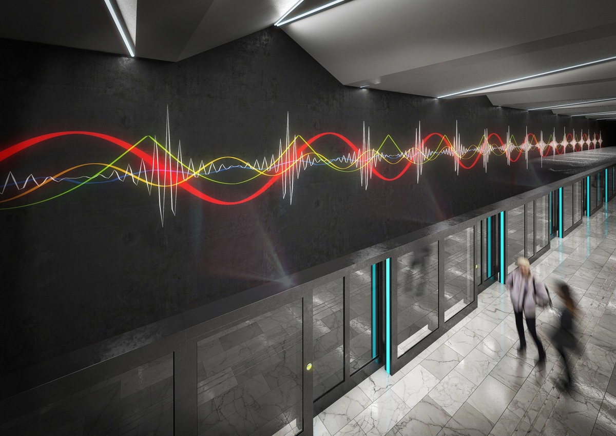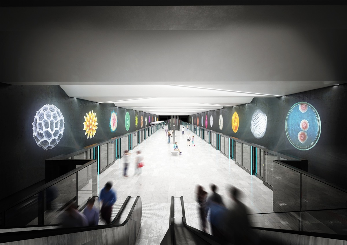 "The most important inspiration in this context is medical research. I have proposed several strategies to work with, two of which have come to fruition so far. The first is an interactive "multi-graph" in the form of an ornament expressing human vital functions. It should be applied to the dominant wall along the track. The second is improvisation with stained glass wheels, the shape of which is based on observation platforms, on which microbiological observations and chemical laboratory research are carried out, for example by looking into a microscope or a petri dish,"