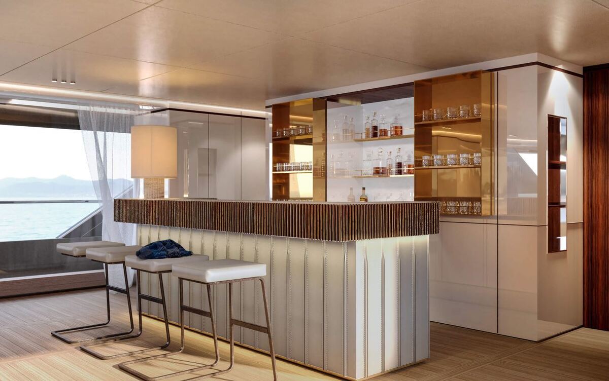 Up to 10 people can head out to the sea enjoying five separate cabins with private bathrooms. In addition, the main cabin has a completely private balcony. And for all, there is a large "infinite" pool at the back of the boat, just a few steps from the sea, or a large dining terrace where you can enjoy al fresco dining. An absolutely luxurious thing is the inner bar, which is decorated partly in gold.