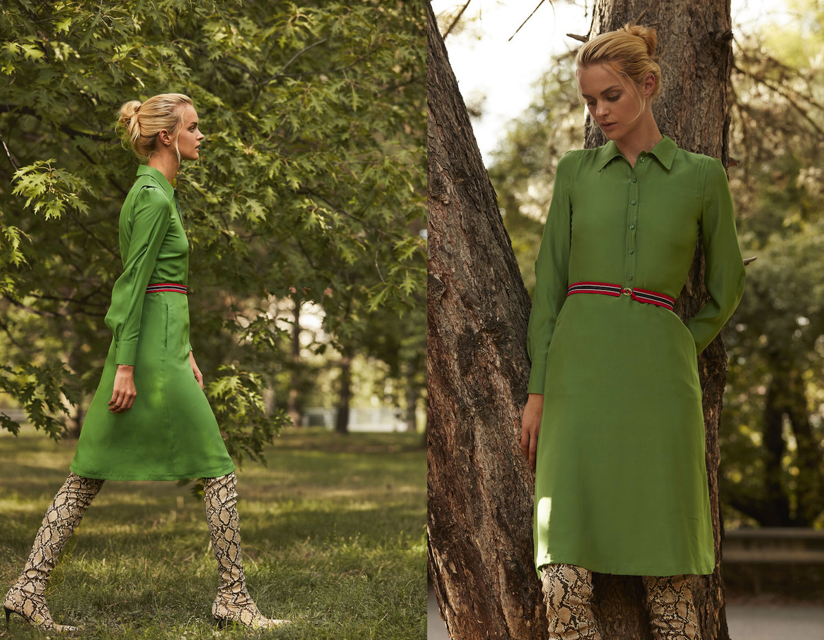 The characteristic features of the AW18 collection are distinctive colors and geometric patterns. These accompany the luxurious outfits from start to finish. Pea green, passionate red, sensual fuchsia, or elegant petrol blue - such shades dominate the elegant line of overalls, sophisticated collar dresses, blouses or atypical pantsuits.