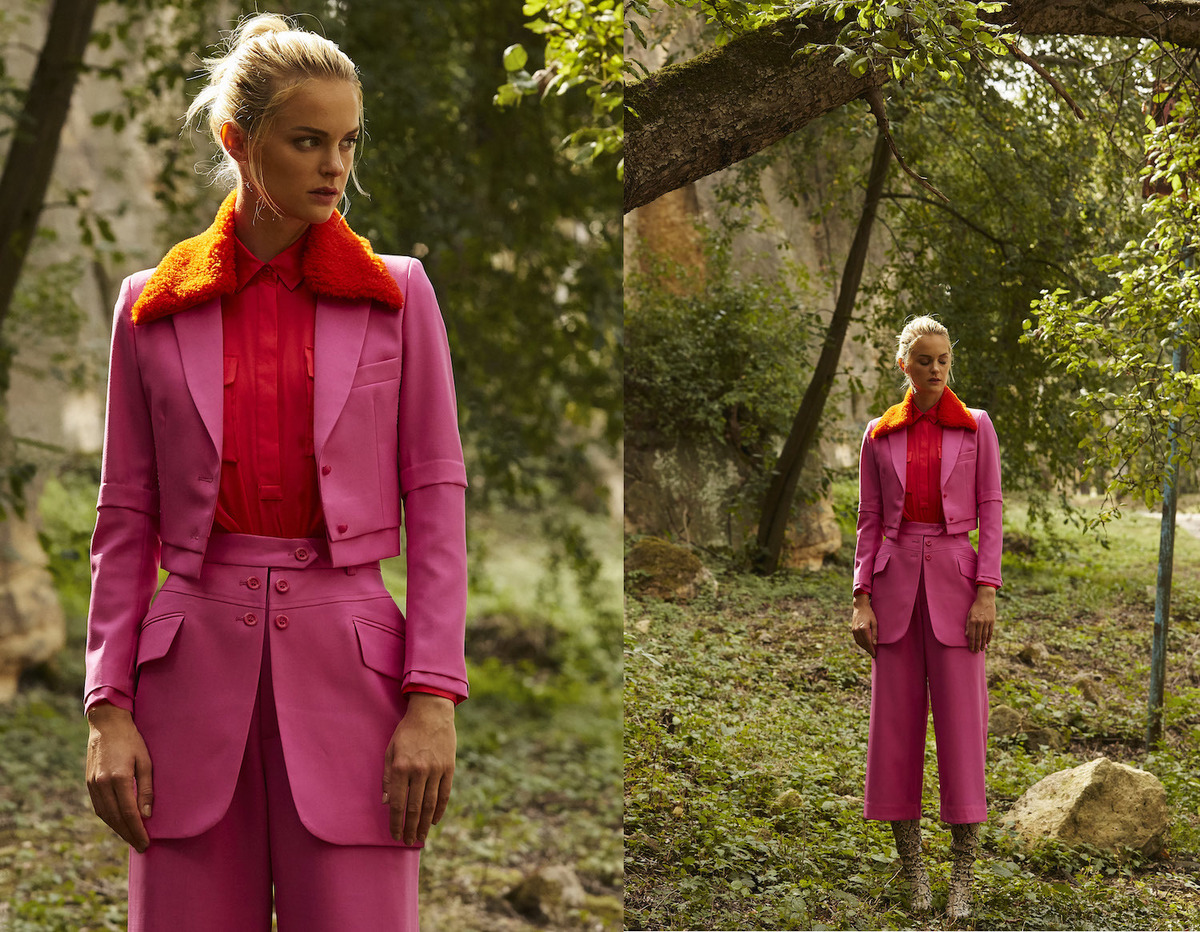 What I enjoy about the AW18 collection is its colorfulness and cuts. Specifically, I loved the pink overalls with a soft red stripe at the waist. The snake ankle boots are so different that it adds to their overall zest! Next, I must not forget to mention the dark blue pantsuit with thin stripes. The pants are especially original! The mini skirt narrowing the waist is perfect! Plus the blouse with the delicate dots and quite provocative silk bra – REBELLION at first sight. It has to be said that we did not see anything like this at any of the famous brands this year. All the more admiration towards Geislerová.
