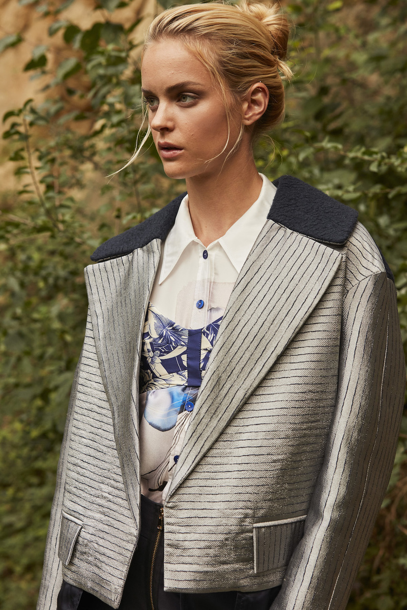 What piece did the designer win us over with? The gray bomber jacket, which is completely minimalist in the front, but has a show of wild patterns and colors in the back. Refined playfulness that we enjoy!