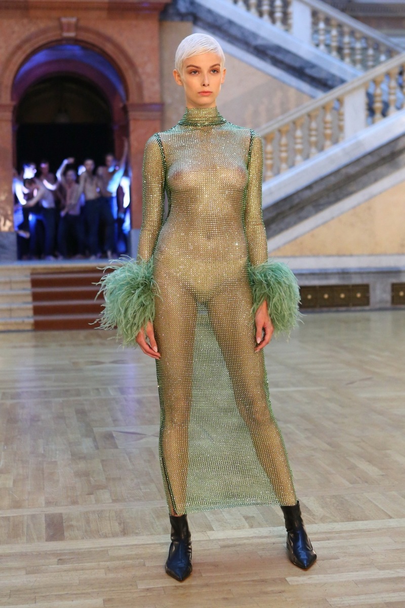 There is also the unmissable sheer dress covered in Preciosa crystals. At first glance it looks like the “jumpsuit” worn by Kim Kardashian West in the latest version of the theme for her reality show. (By the way, that was a piece from the Gucci Fall 2017 collection worth an incredible 264,000 CZK.) However, it must be noted that Zuzana did her own thing. What we see here is a luxurious gown with green ostrich feathers on the sleeve cuffs. Overall impression? Fantastic!!!